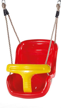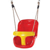 The red plastic swing seat is safe and secure, with a high back, t-bar and lap belt harness to keep little ones comfortable and snug.