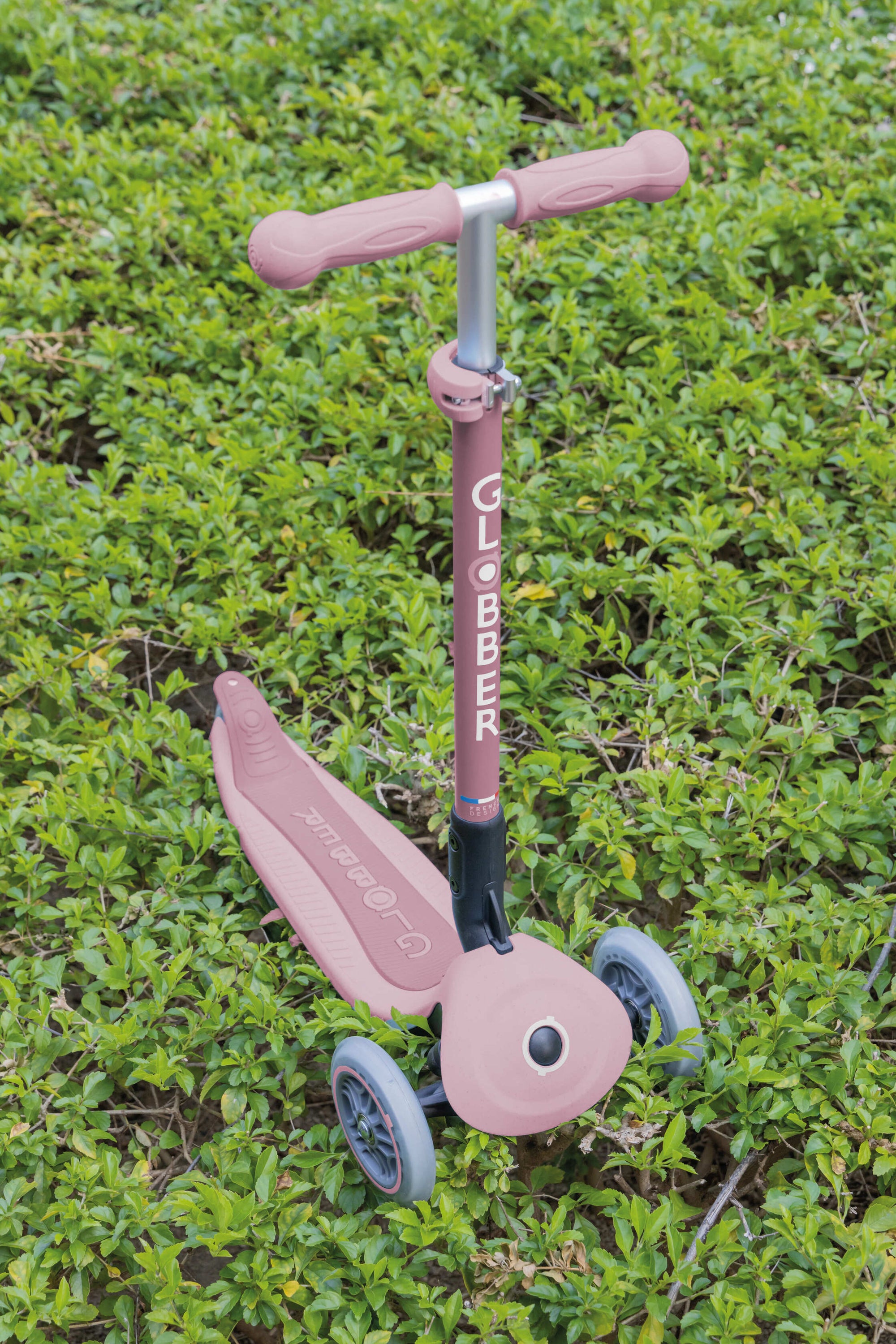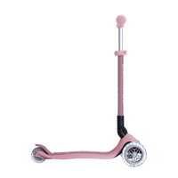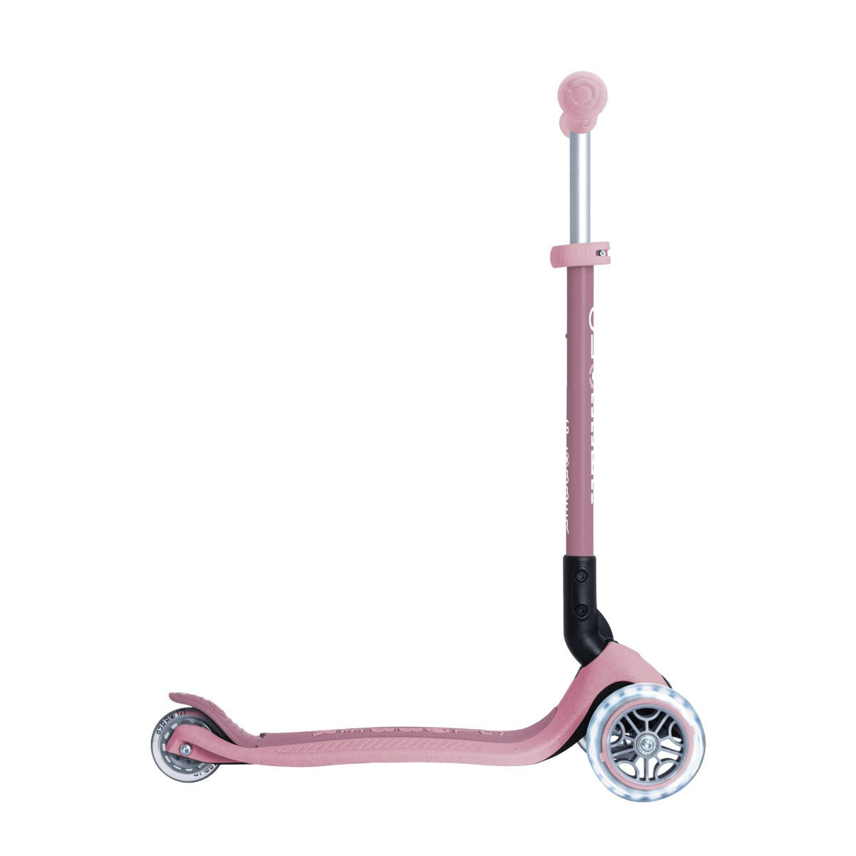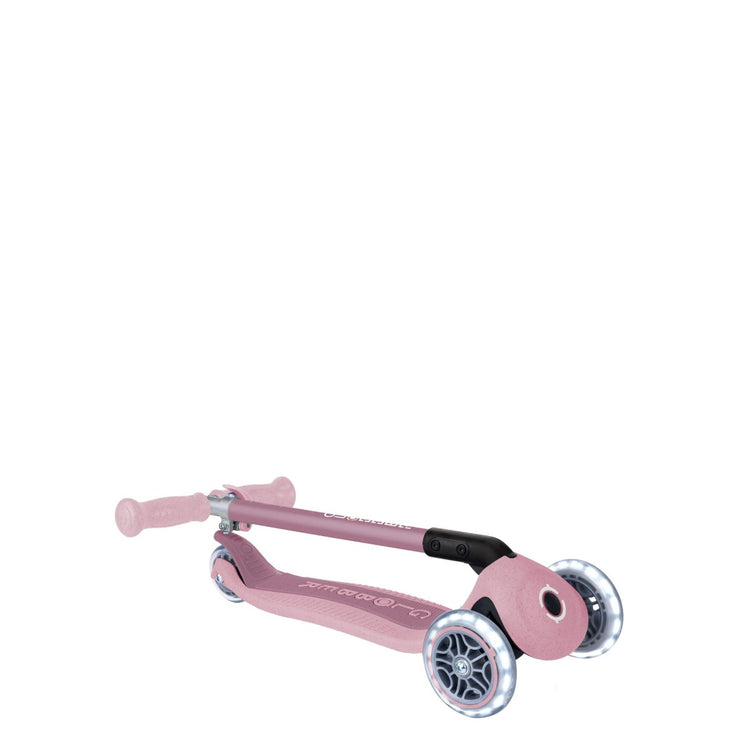 Eco-minded 3-wheel with patented fold, steering-lock for beginners and battery-free LED wheels. Made with GRS recycled plastic and wheat-straw bioplastic components.