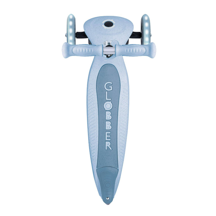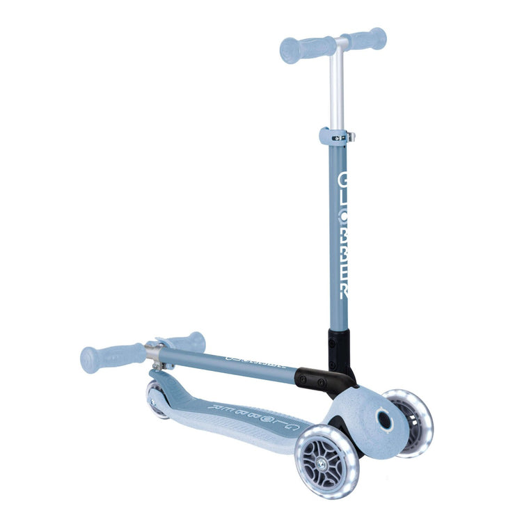 Eco-minded 3-wheel with patented fold, steering-lock for beginners and battery-free LED wheels. Made with GRS recycled plastic and wheat-straw bioplastic components.