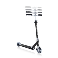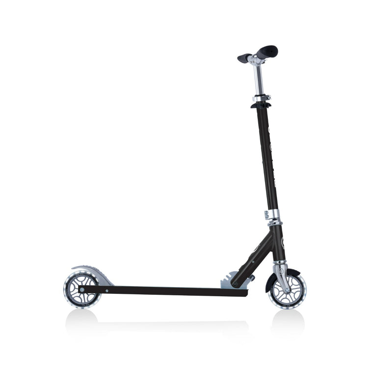 Folding 2-wheel scooter with battery-free LED 125 mm wheels, anti-slip aluminium deck, long rear brake and a 4-height T-bar. Light, sturdy and ready to roll.