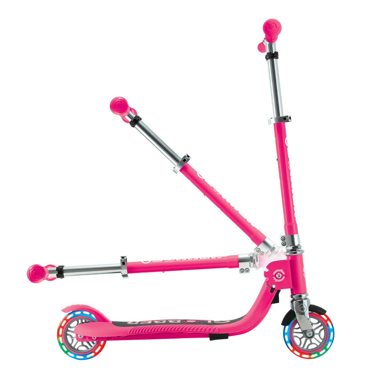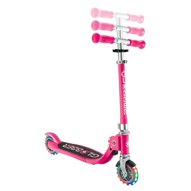 A confident step to 2 wheels for ages 3+. Push-button fold, battery-free LED wheels, 3-height T-bar and a reinforced deck supporting up to 50 kg.