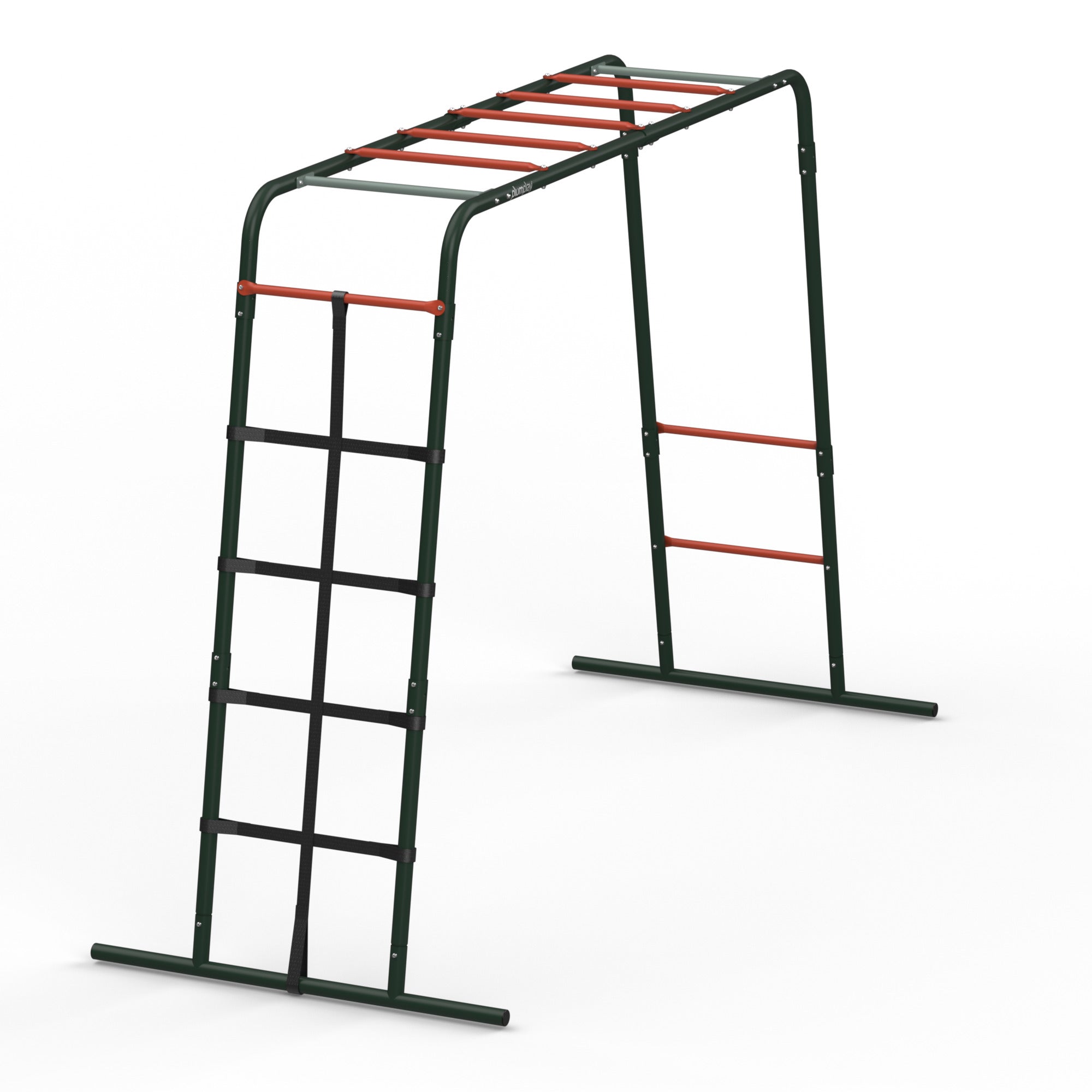 A freestanding favourite for strength and confidence. Powder-coated steel monkey bars with anti-slip rungs and a side climbing net create varied routes and everyday challenges—no concrete platform required.