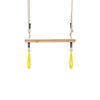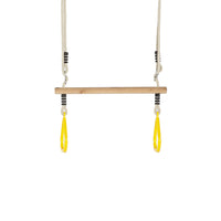 Wooden trapeze accessory with plastic handles and soft poly-hemp ropes
